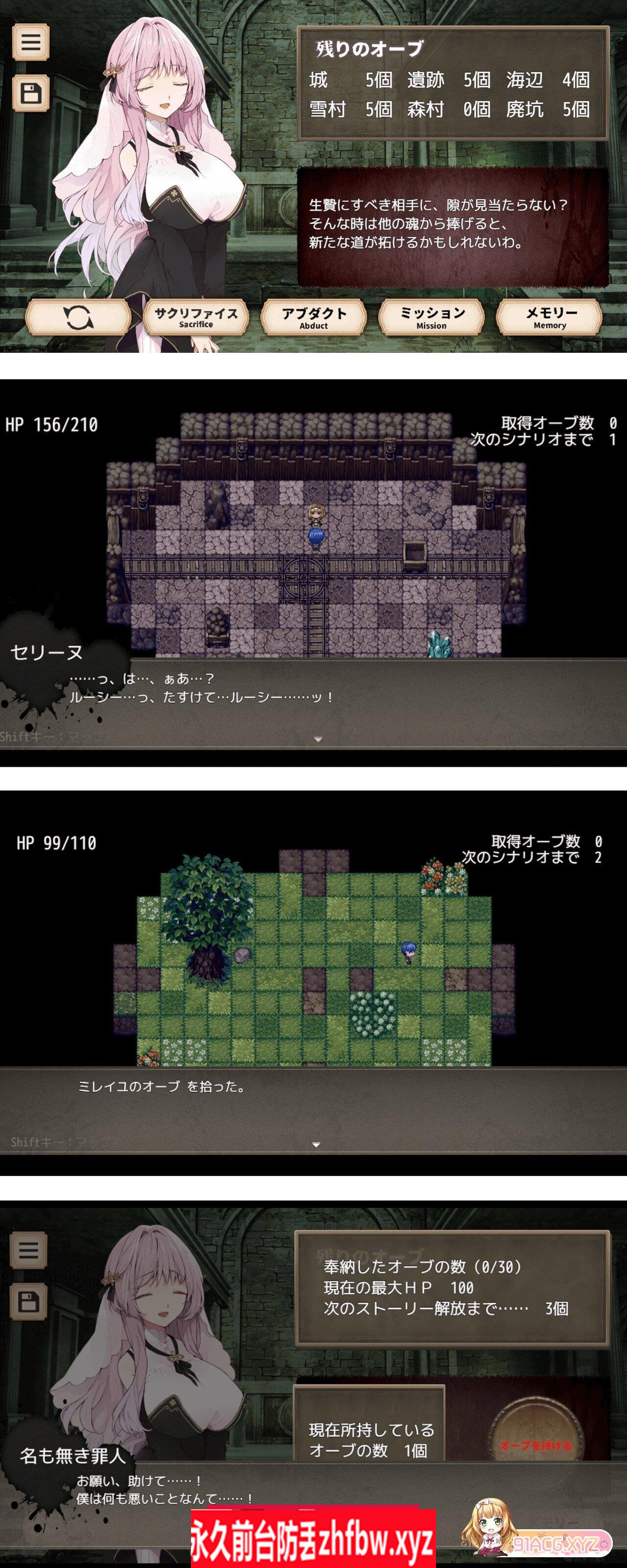 [探索与宝珠的回收] 游戏的玩法非常简单。 在探索地图的过程中,找到拥有牺牲灵魂的罪人们, 并收集他们的灵魂所化为的”宝珠”。 将宝珠献给基地后,邪神的力量将会增大, 故事会继续向下一个阶段发展。 [道具与任务] 除了宝珠之外,地图上还会出现许多道具。 完成来自米库鲁和拉提的”任务”,她们的好感度会提升, 直至达到一定数值后,会发生……。 [回忆模式] 游戏完成后,在标题画面会解锁专门的回忆模式。 您可以在喜欢的时机观赏CG和事件场景。 即使您很忙碌,也可以放心享受!
